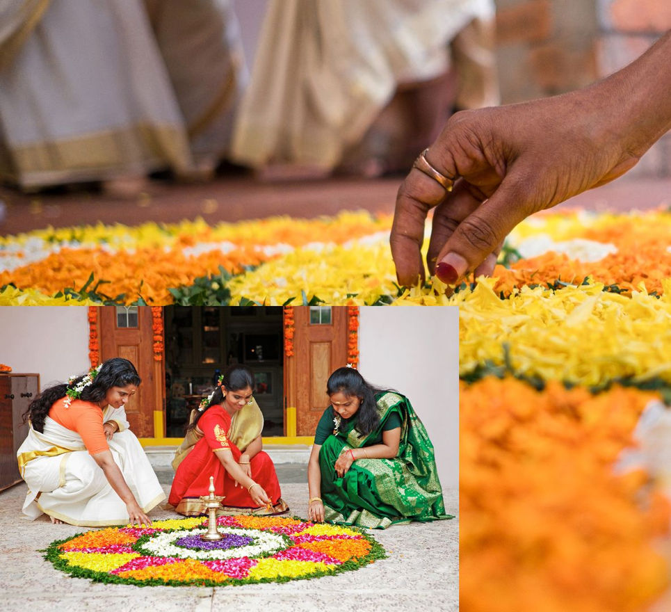 Using rice flour, women delicately create the Kōlam design using their fingertips at the entrance of homes.